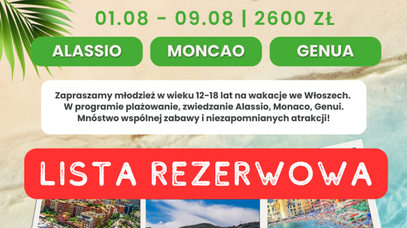 Zapraszamy serdecznie młodzież w wieku 12-18 lat na wyjazd kolonijny do Alassio (Włochy), który odbędzie [...]